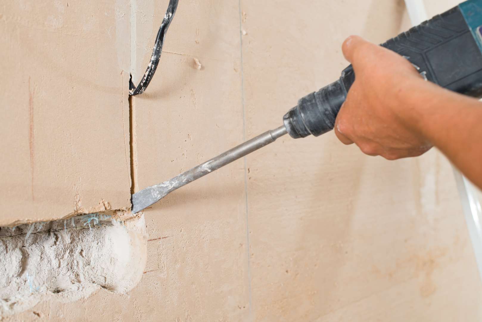 ハンマーとノミ(チゼル)を使った手作業は、最も基本的かつ高度な技術です。コンクリートの表面を数ミリ単位で削って平らに整えたり、あえて凸凹をつけてデザイン性を持たせる「はつり仕上げ」を行ったりする際に用いられます。機械では力が強すぎて壊しすぎてしまうような、配管周りの細かい調整などでも、この昔ながらの手作業が活躍します。