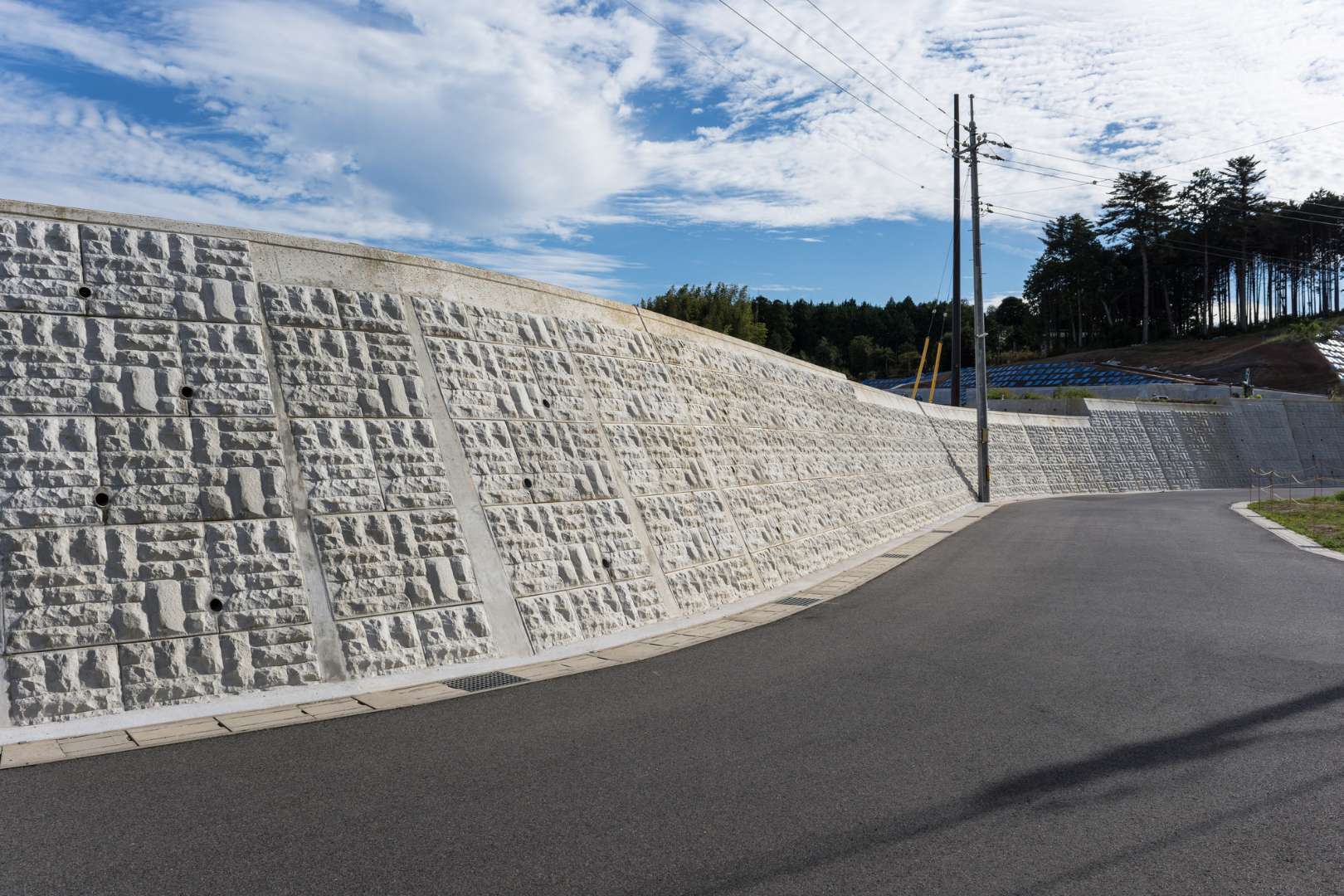 これはブロックの中が広い空洞になっており、積み上げた後に太い鉄筋を通し、空洞にコンクリートを隙間なく流し込んで固めます。これにより、鉄筋コンクリートの壁と同じように土砂の重い土圧に耐えられる、非常に高い強度が生まれます。