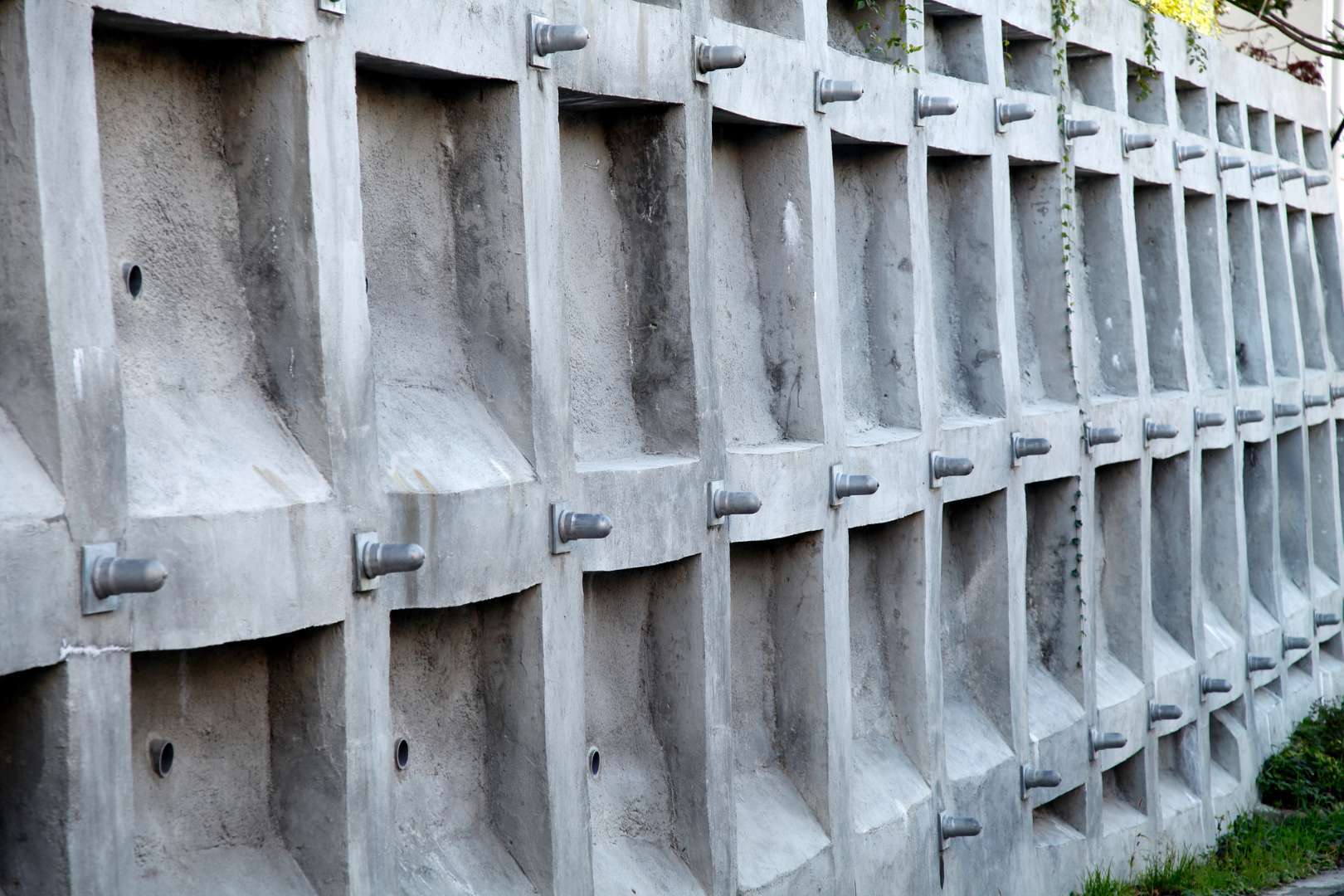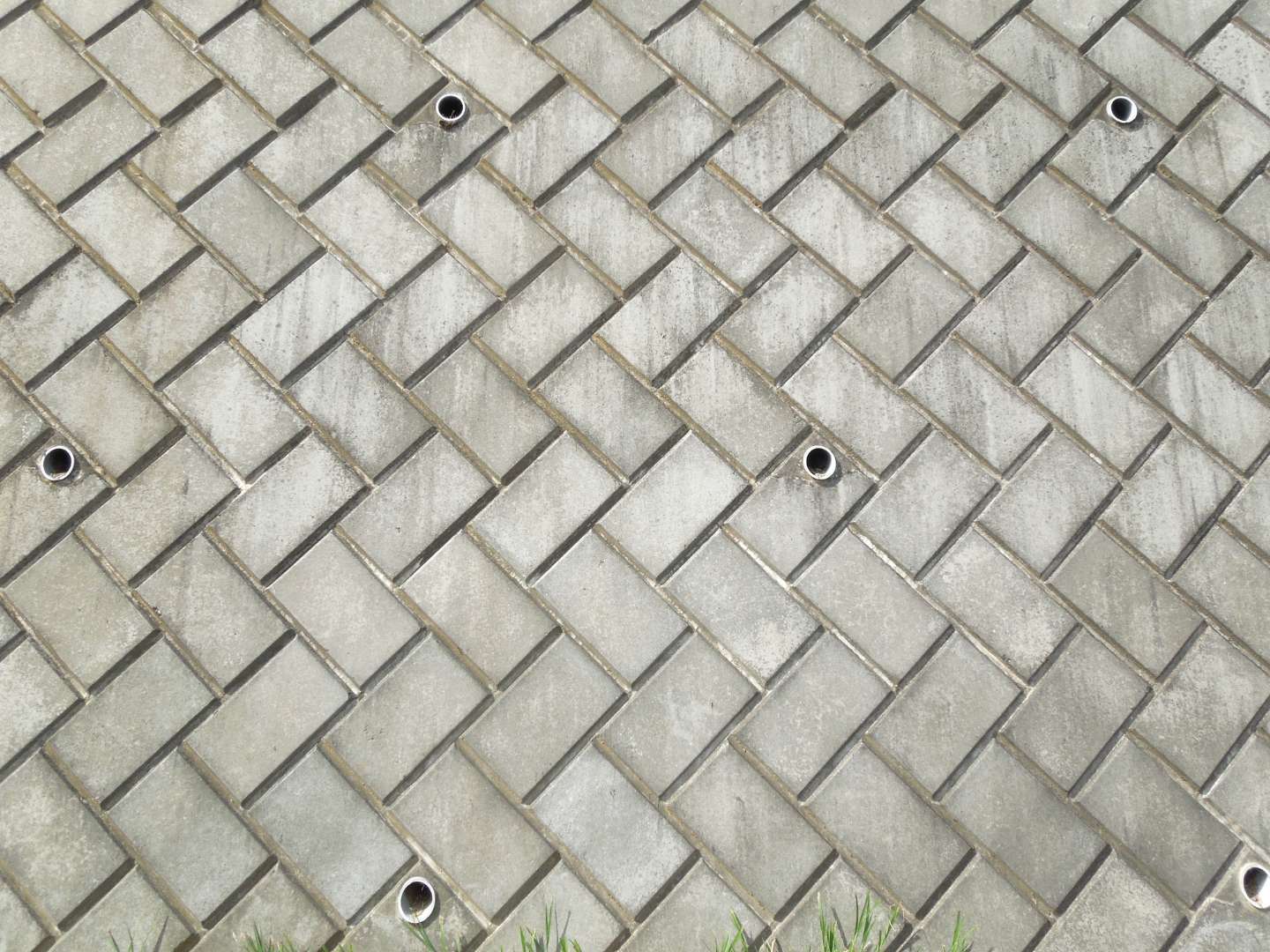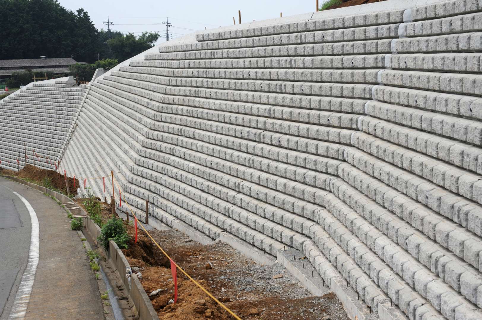 間知(けんち)ブロック擁壁は、斜面にブロックを積み上げていく工法です。昔の石積み(お城の石垣のような見た目)によく似ており、ブロックの裏側にコンクリートを流し込んで固めて構築します。